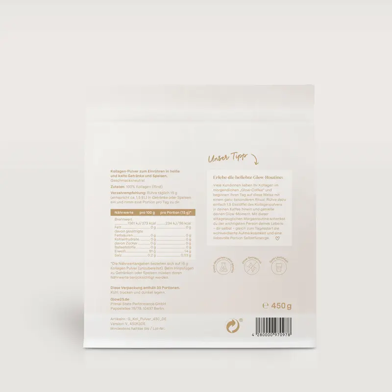 Die 450g Packung von Glow25 ist praktisch! Typ 1 & 3 Kollagenpeptide, hydrolysiert ¨C l?st sich gut, neutraler Geschmack, passt in jede Ern?hrungsroutine.